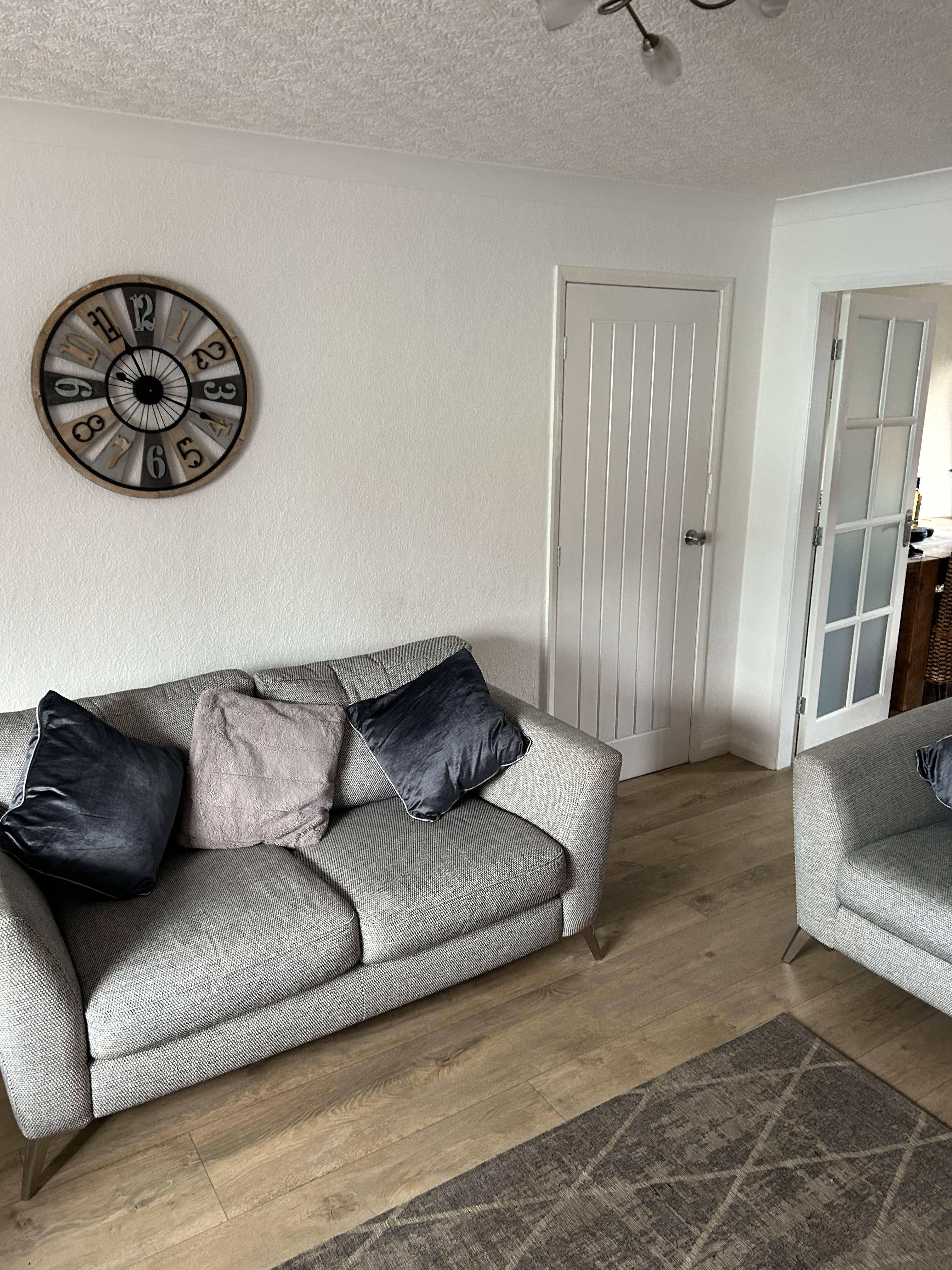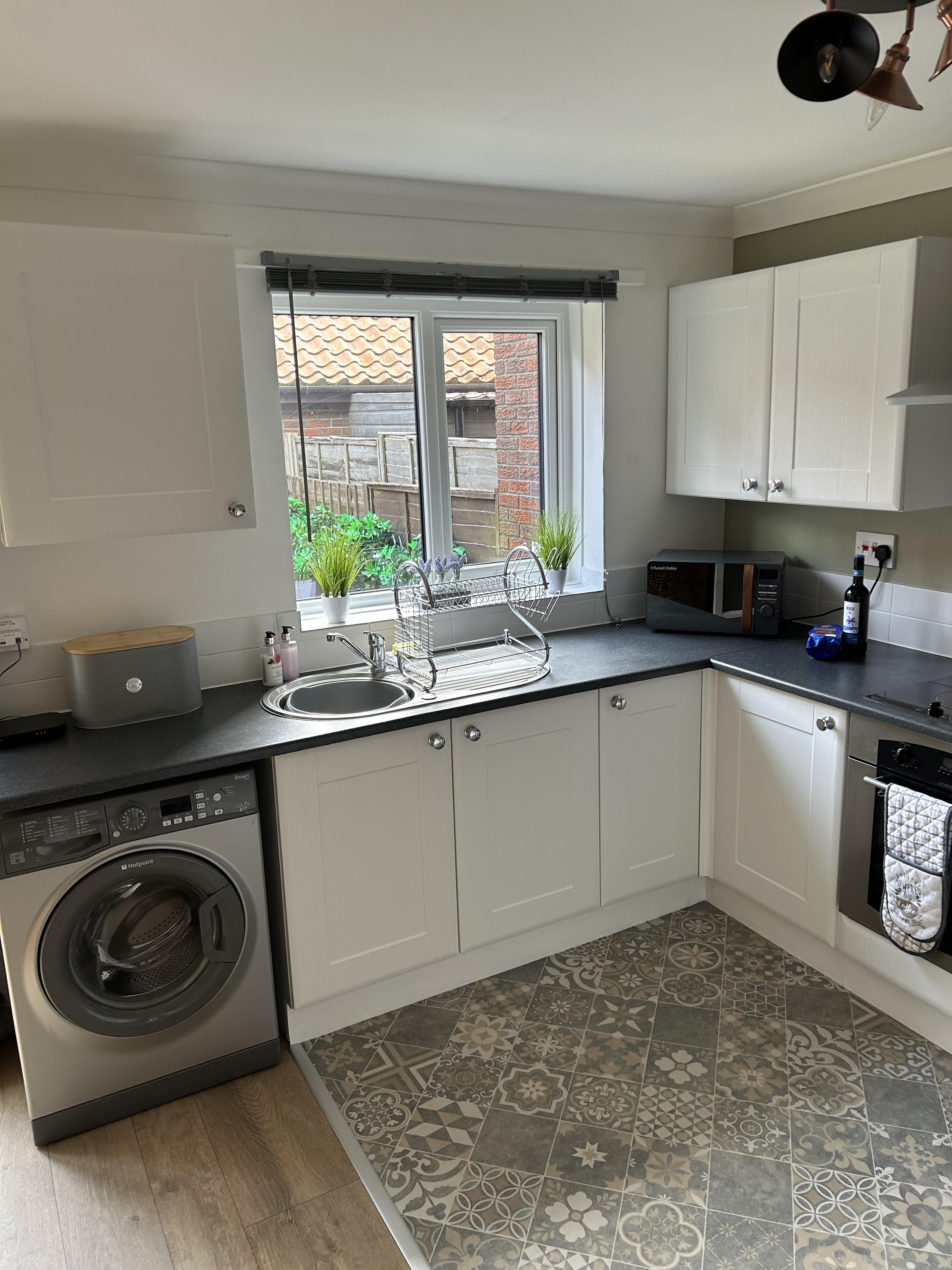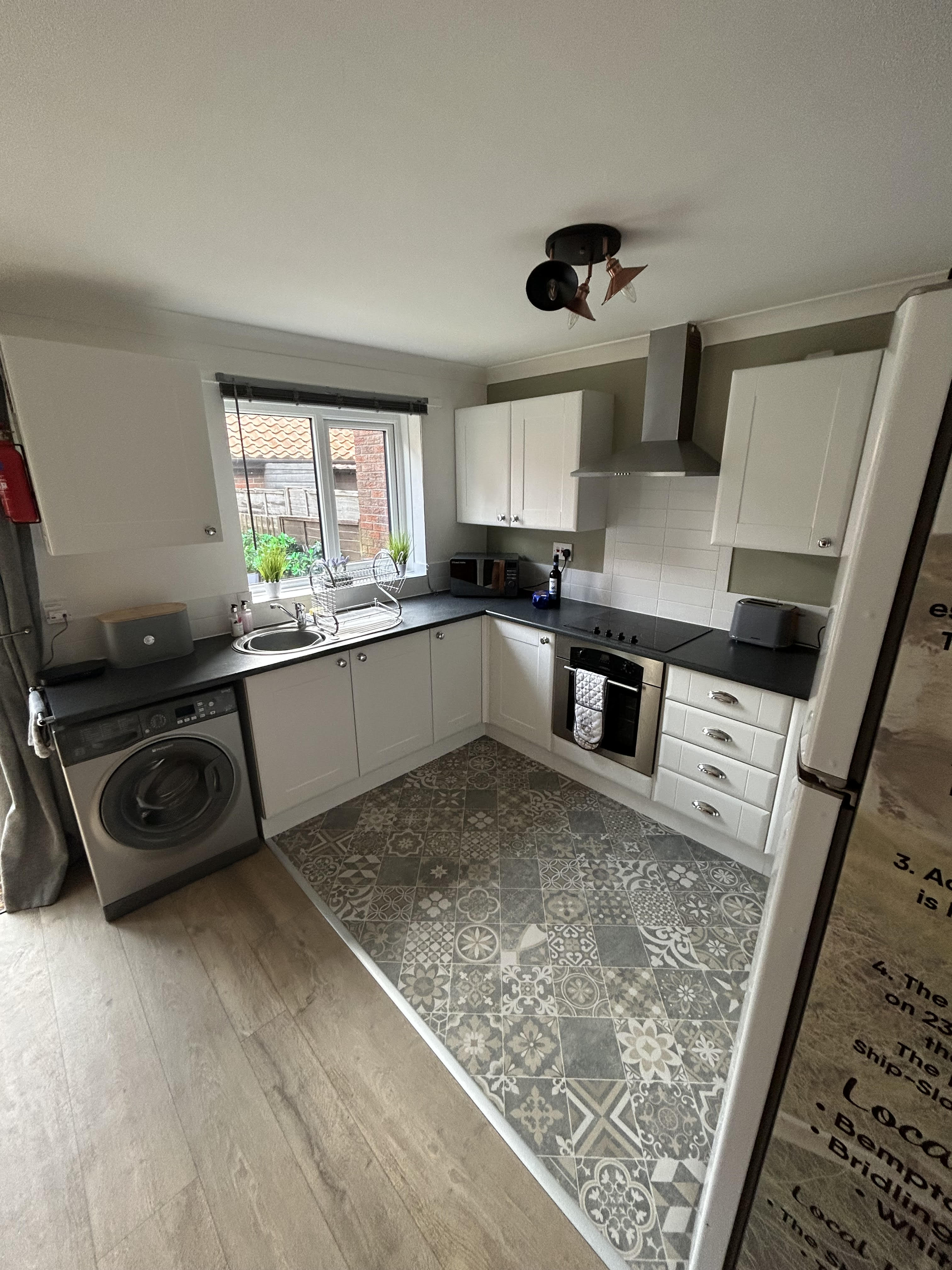 Fully fitted kitchen with washing machine, oven/hob, microwave and fridge/freezer