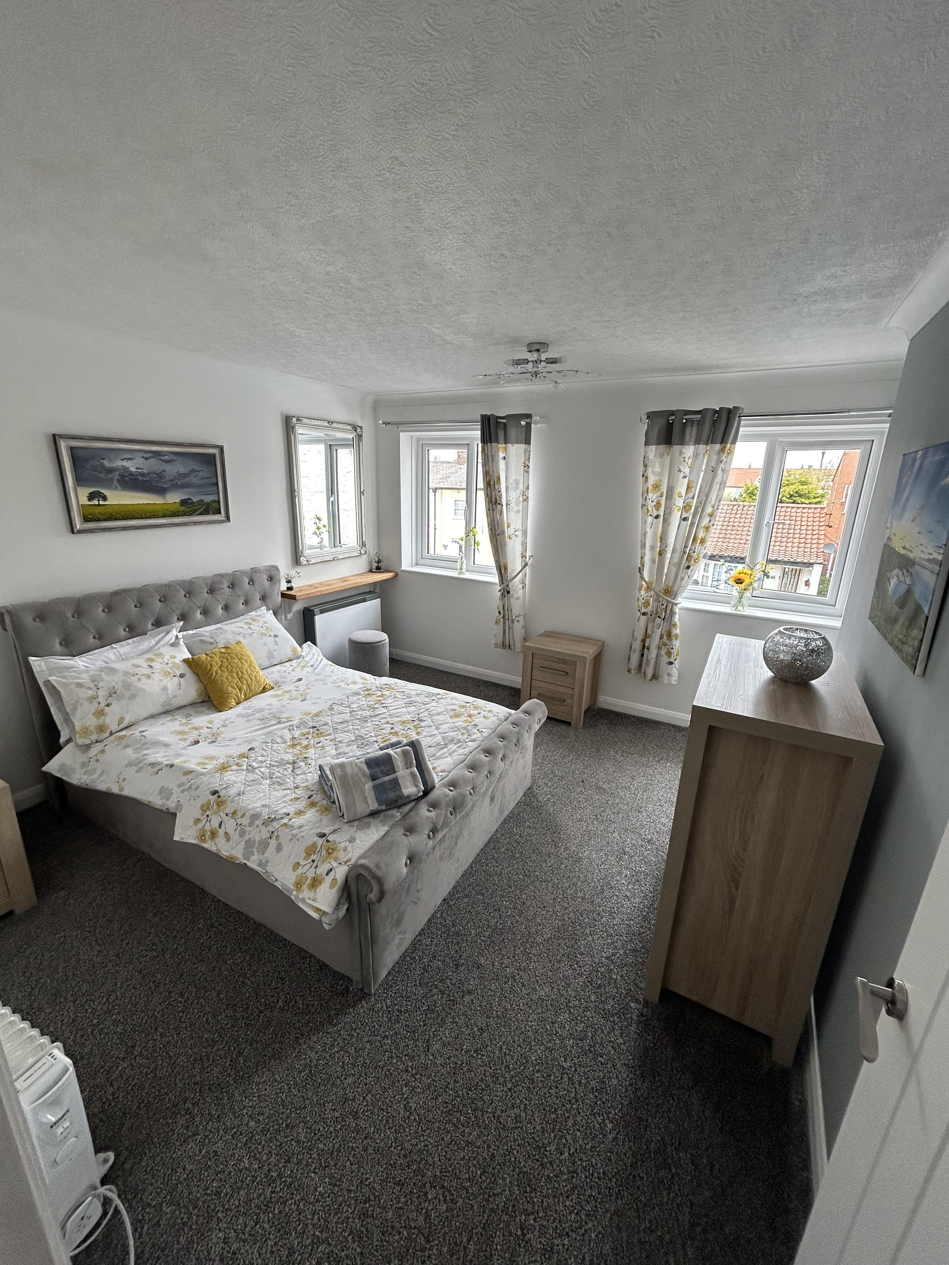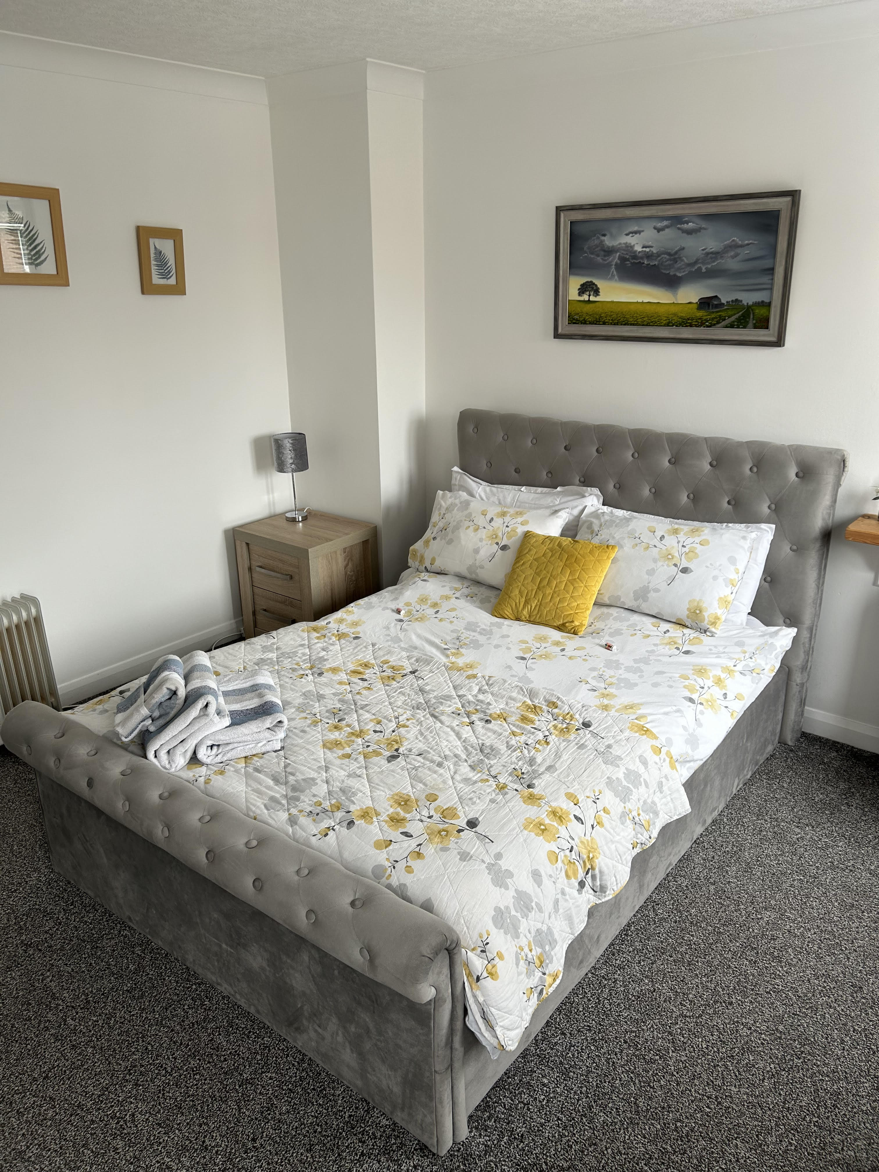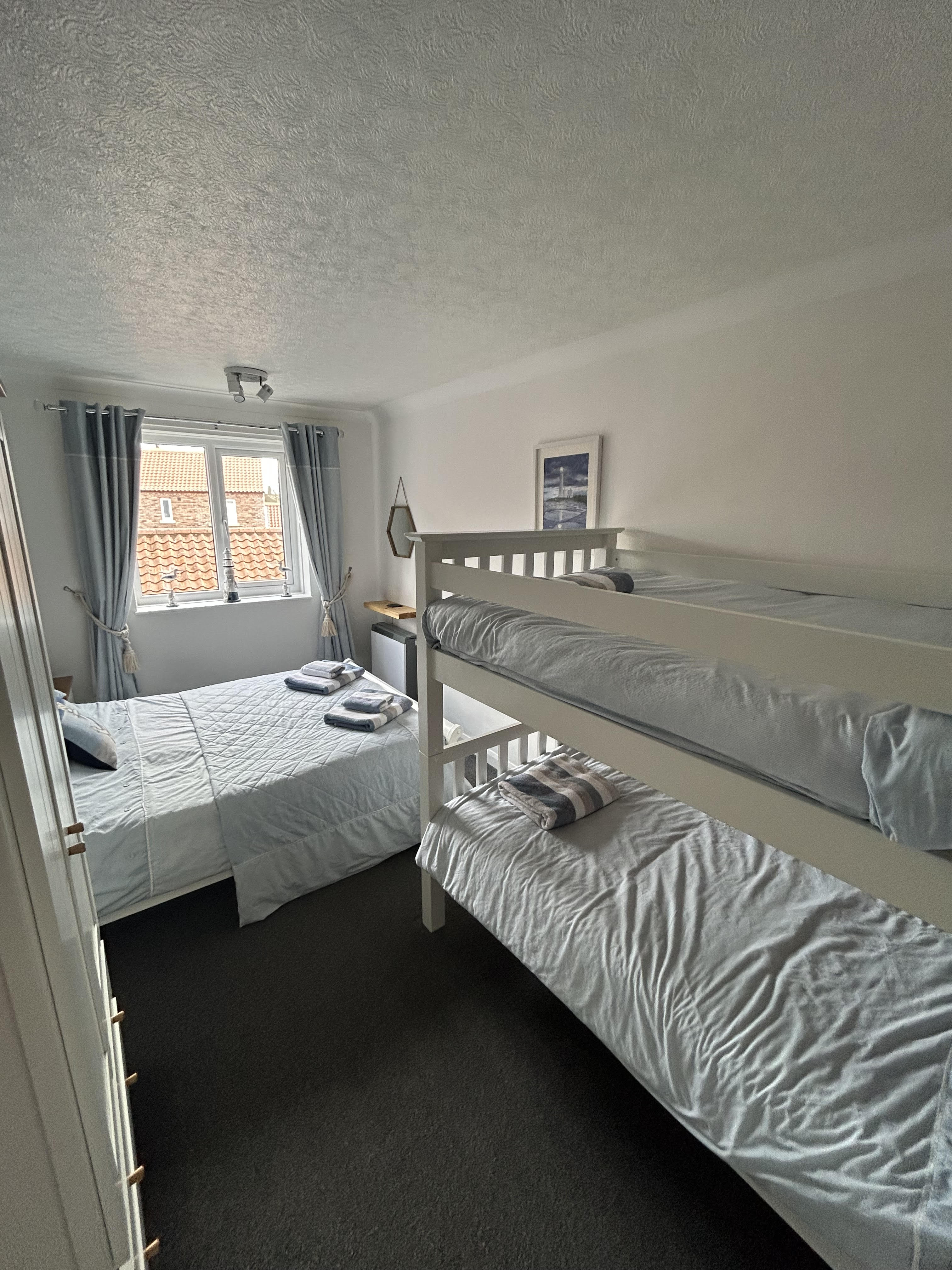 Two bedrooms, one double bedroom and one family room, with a double bed and full size bunk beds