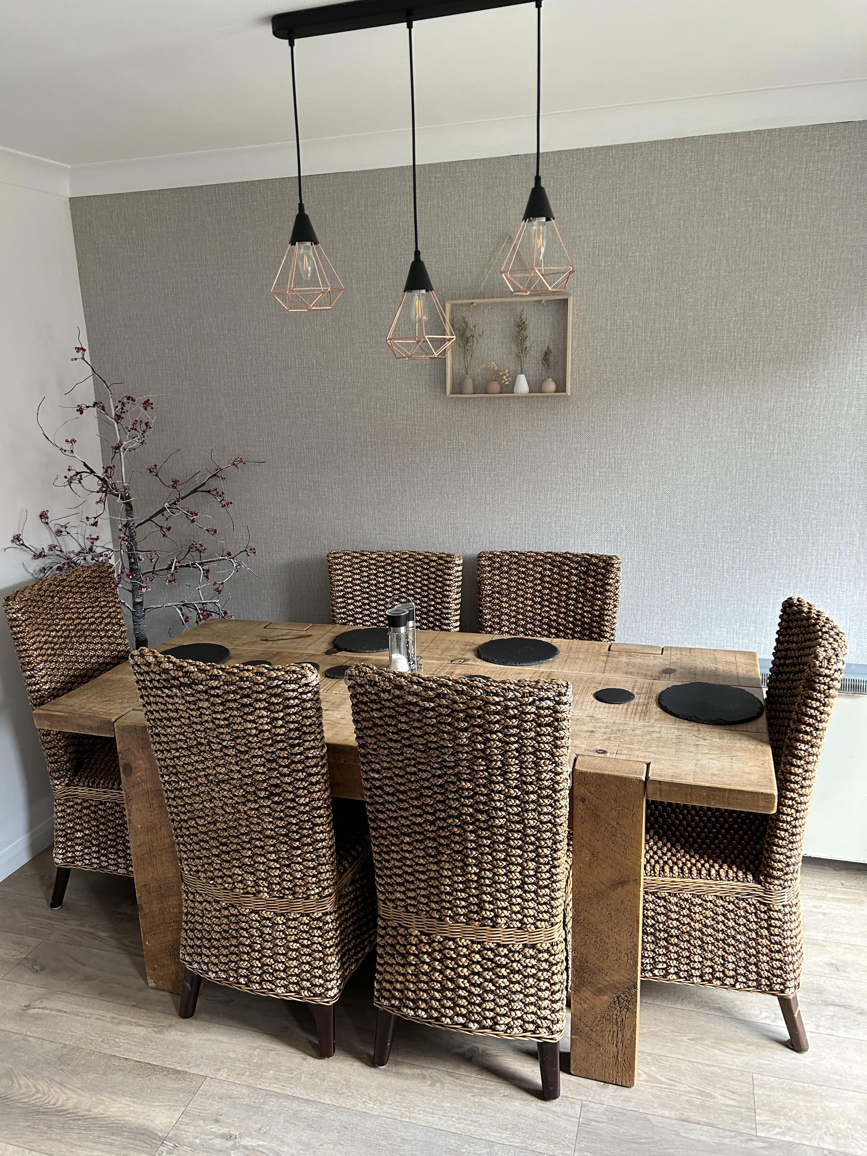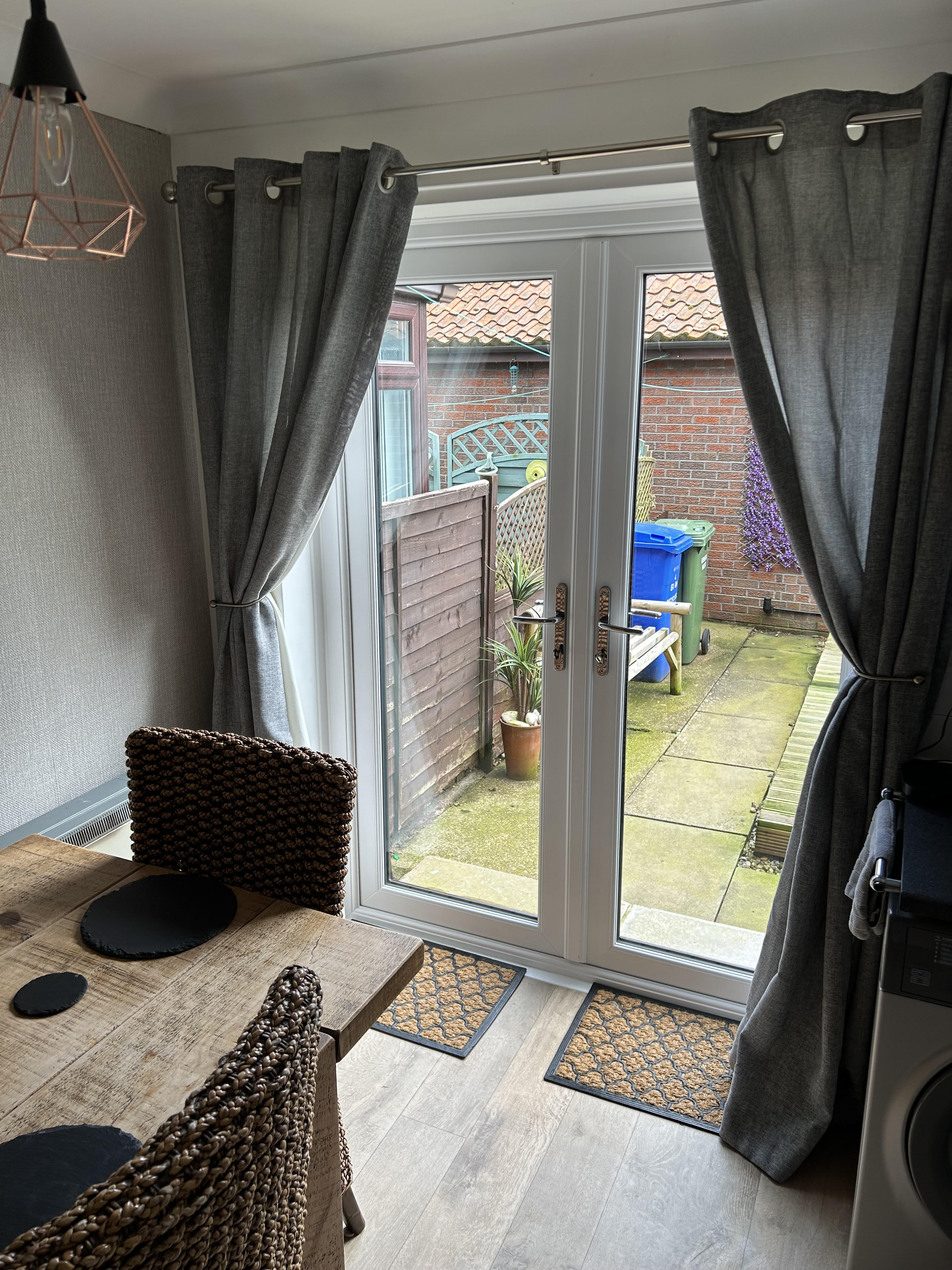 Kitchen / Diner with large dining table and six chairs with patio doors leading onto the enclosed garden with outdoor furniture