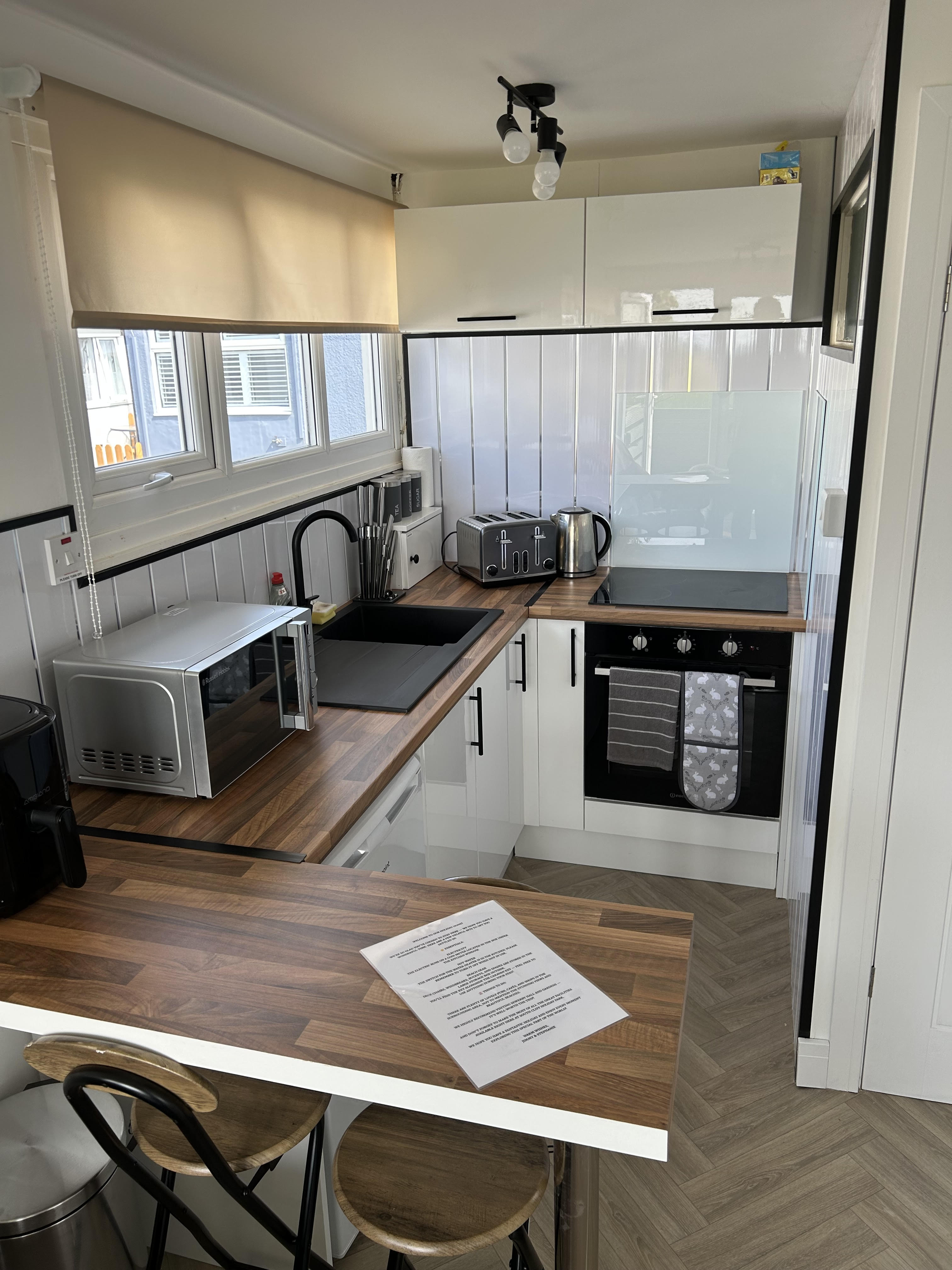 Fully fitted kitchen with oven and hob, toaster, kettle, microwave, air fryer and under counter fridge/freezer, breakfast bar with stools.