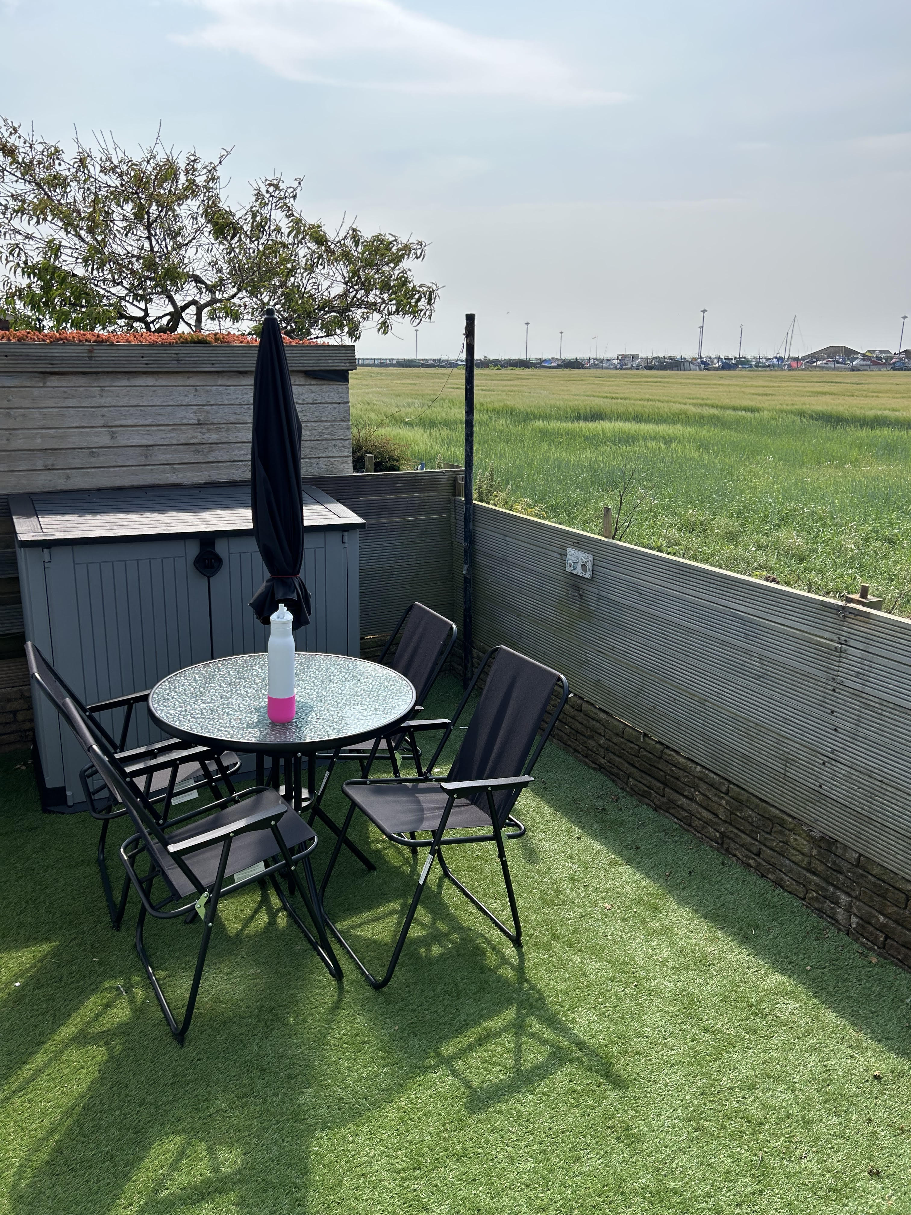 Spacious secured garden with artificial grass and outdoor furniture, overlooking open fields and sea views.