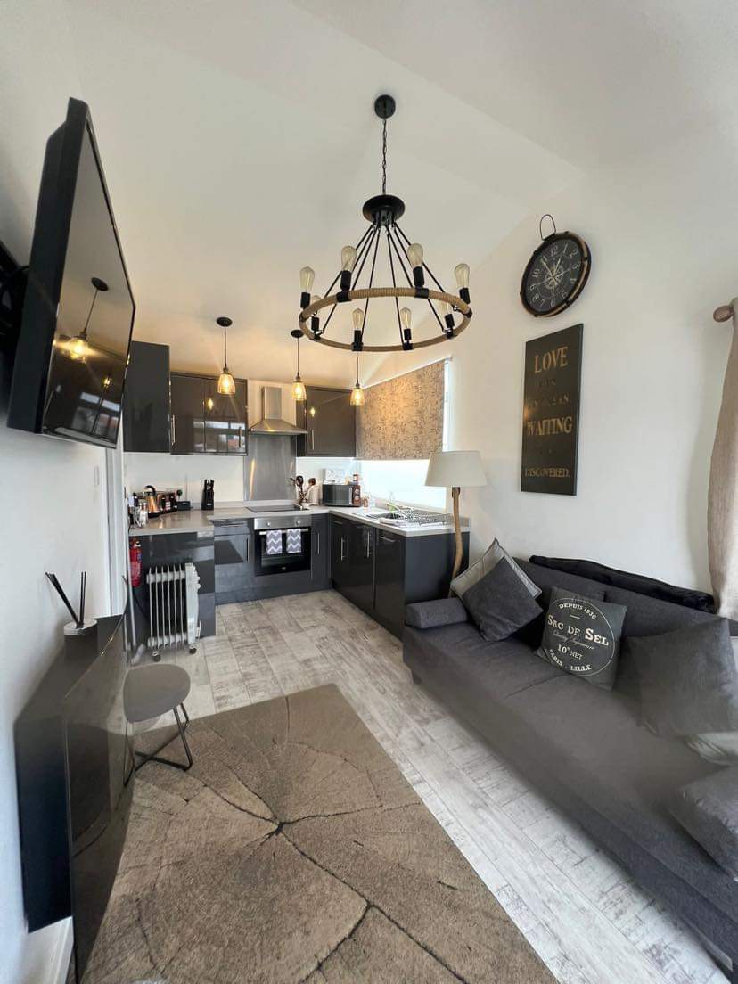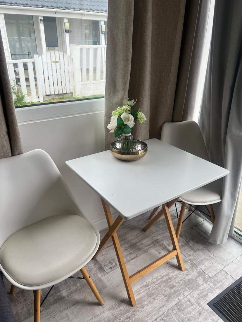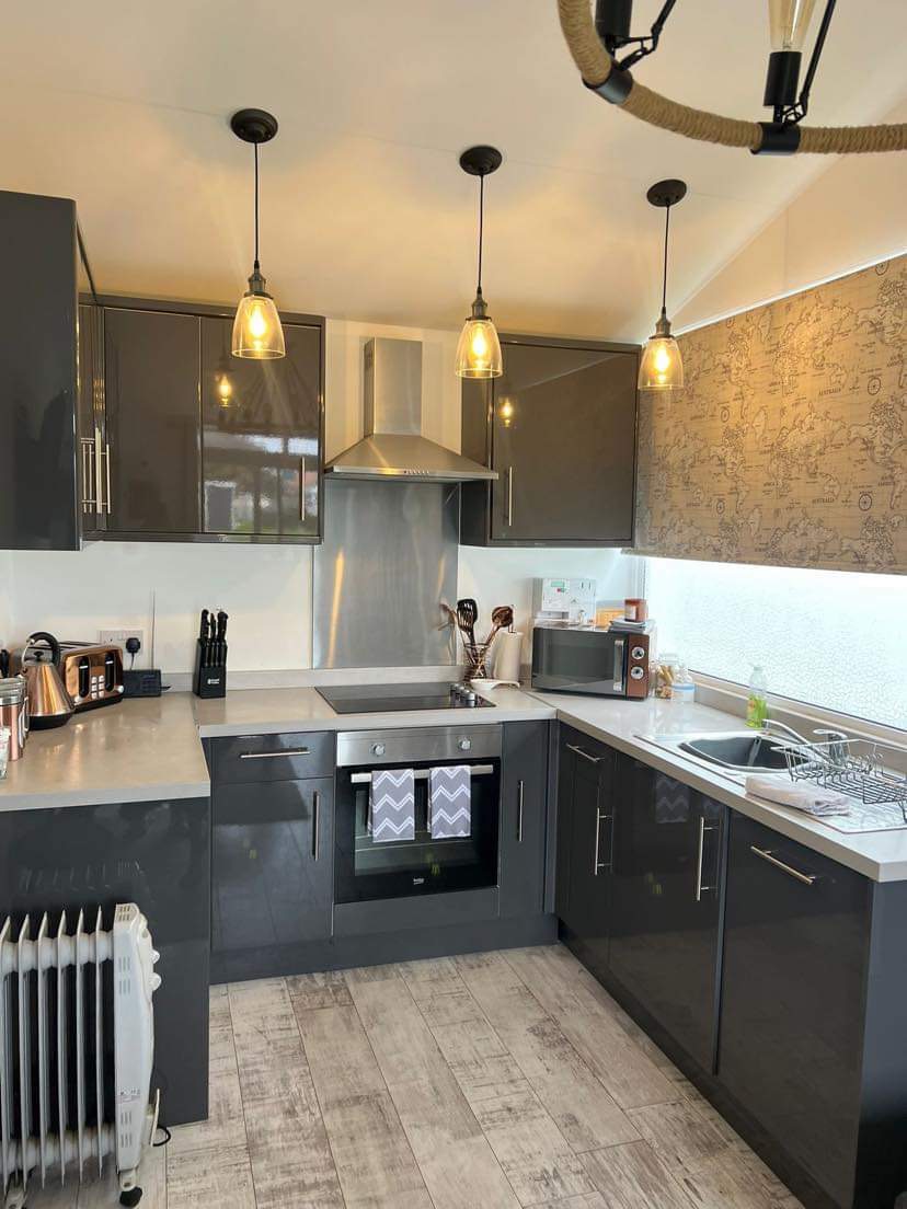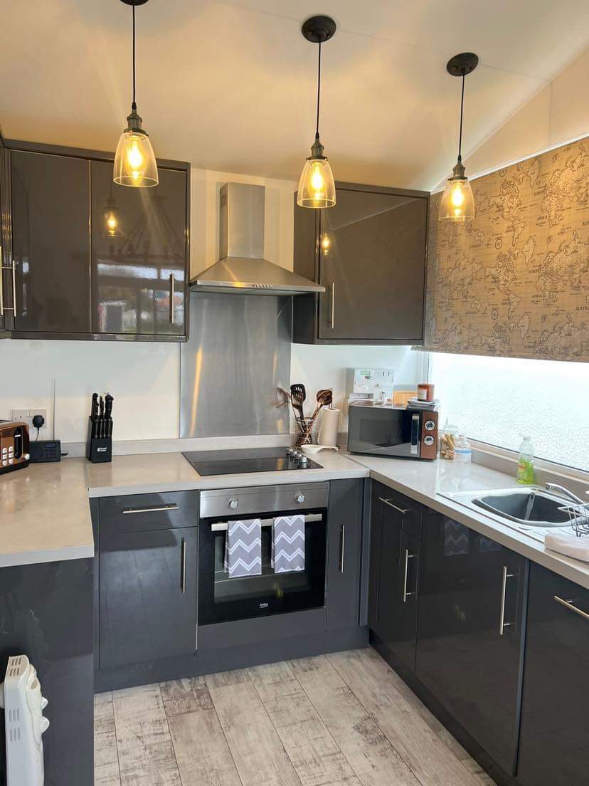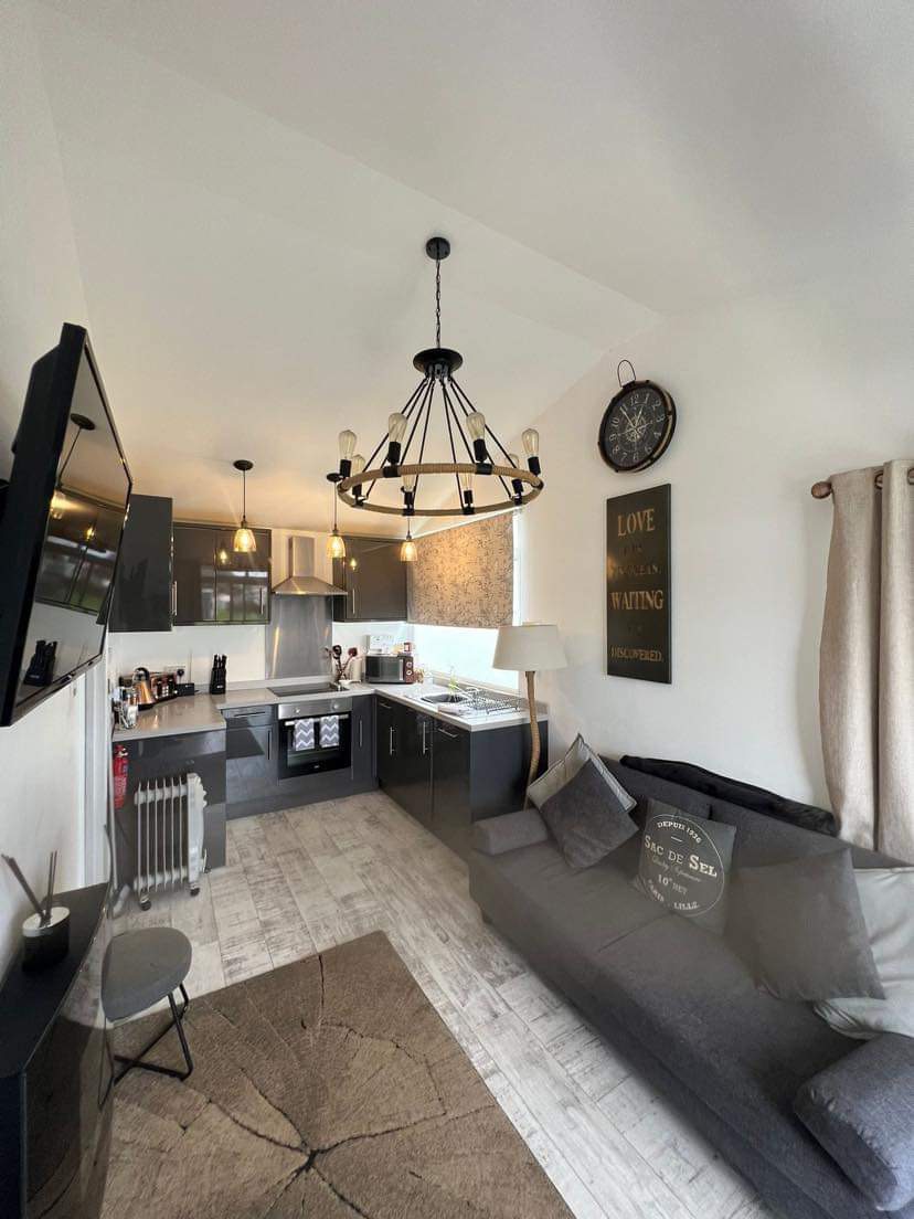 This modern, contemporary chalet has a beautiful open plan living room and kitchen with ceramic hob, oven, dishwasher, constant hot water, fridge, counter top freezer, microwave and popcorn maker for those cosy nights in watching the 43 inch wall mounted TV, cosy wall mounted fire with mood lighting and dining table for 2.