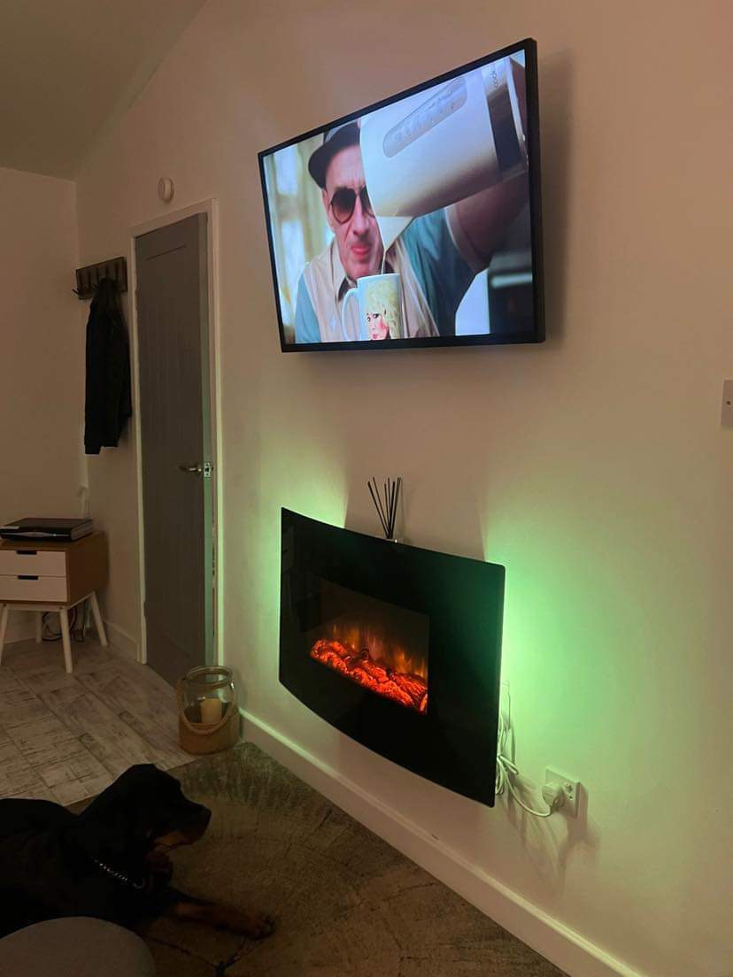 Wall mounted 43 inch TV & wall mounted fire with mood lighting.