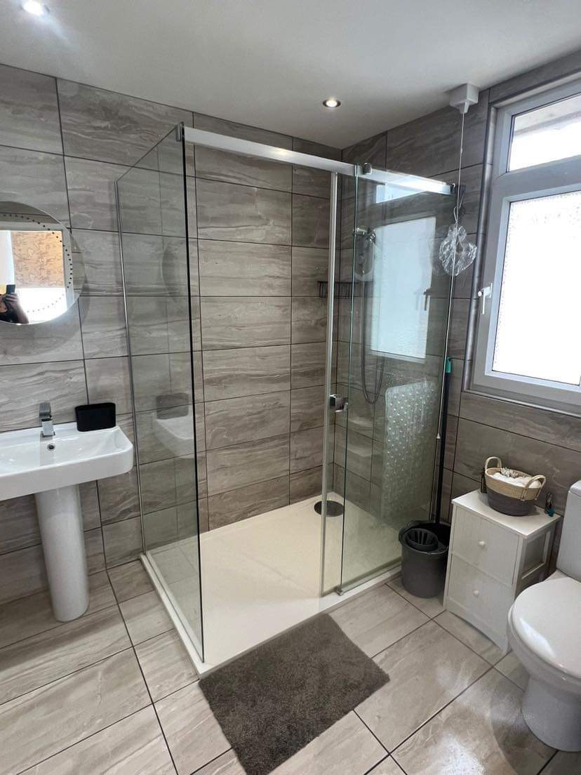 Luxury Bathroom fully tiled, with large walk in shower, and electric towel rail.