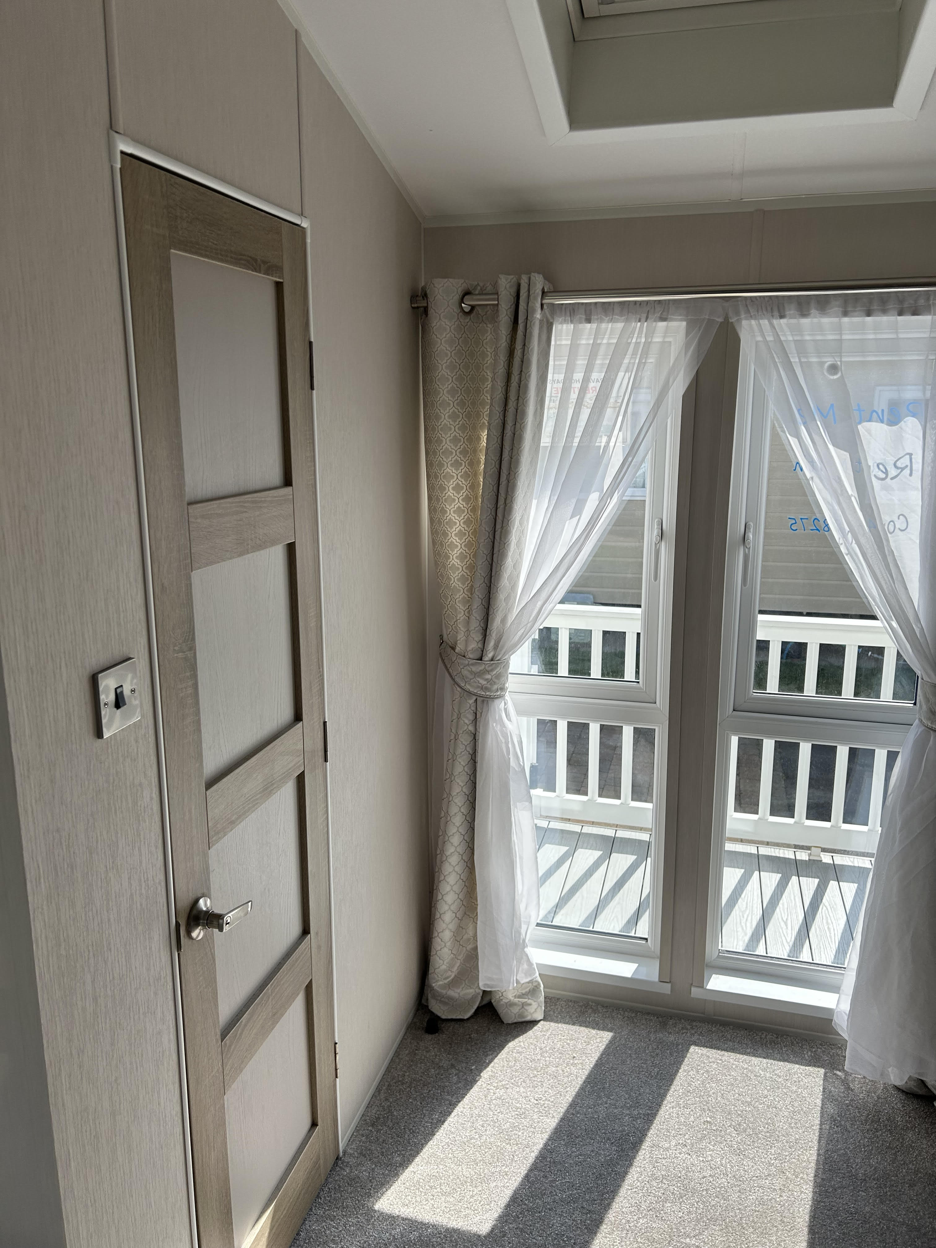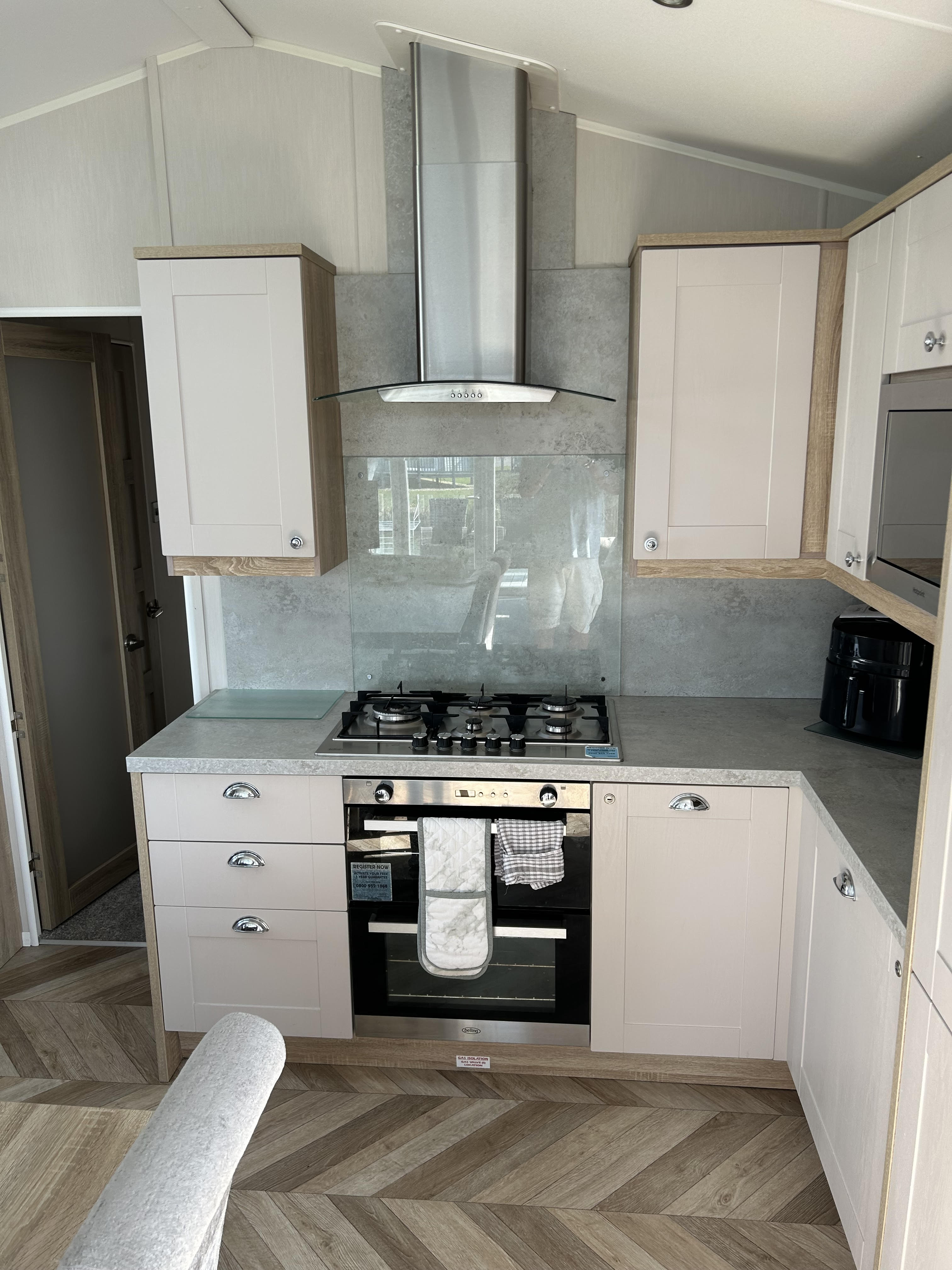 Luxury (2021 Vogue Classique model), 2 bed top of the range caravan with stunning views of the new lakeside development, with added benefit of a spacious decked area boasting glass balustrading and contemporary outdoor furniture.