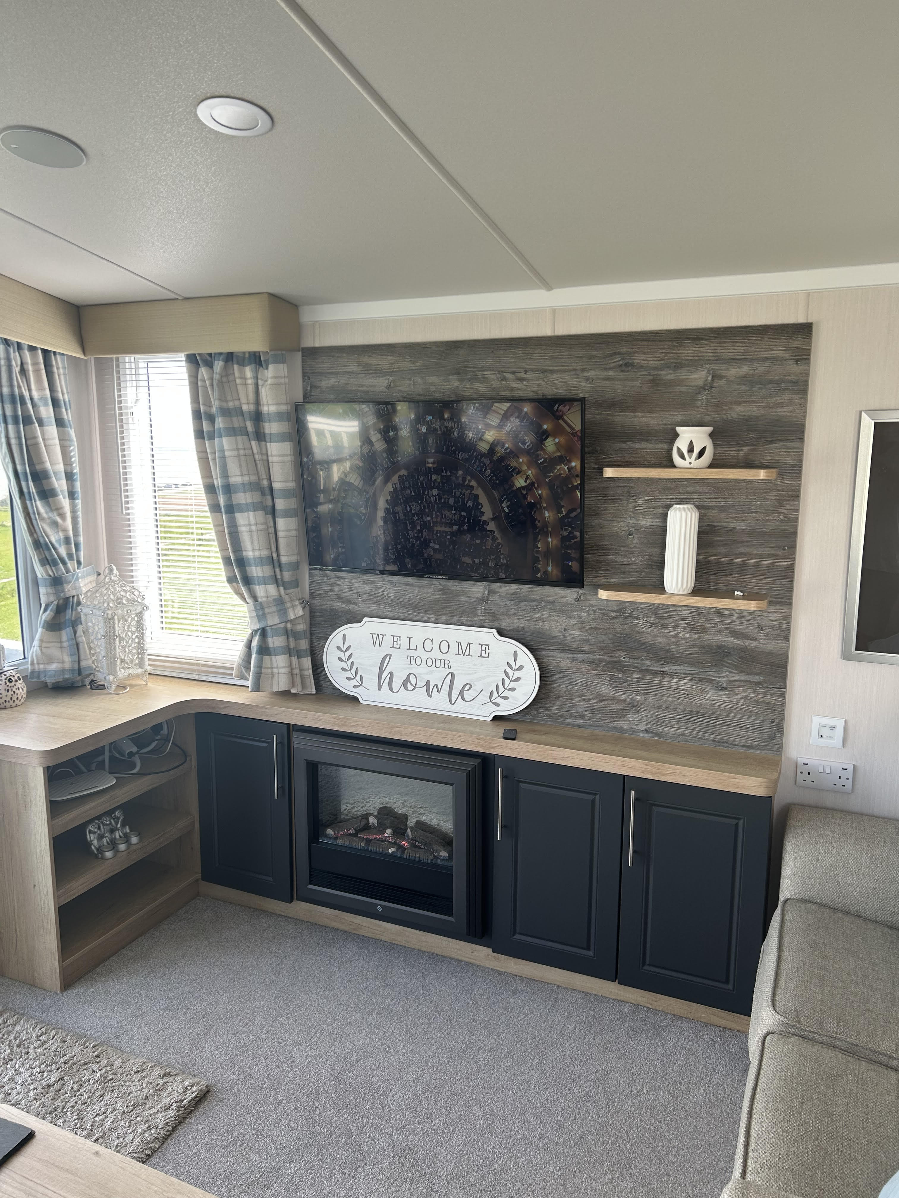 Spacious & cosy lounge with 3 & 2 seater sofas, wall mounted smart TV with Freesat, coffee table and electric fire