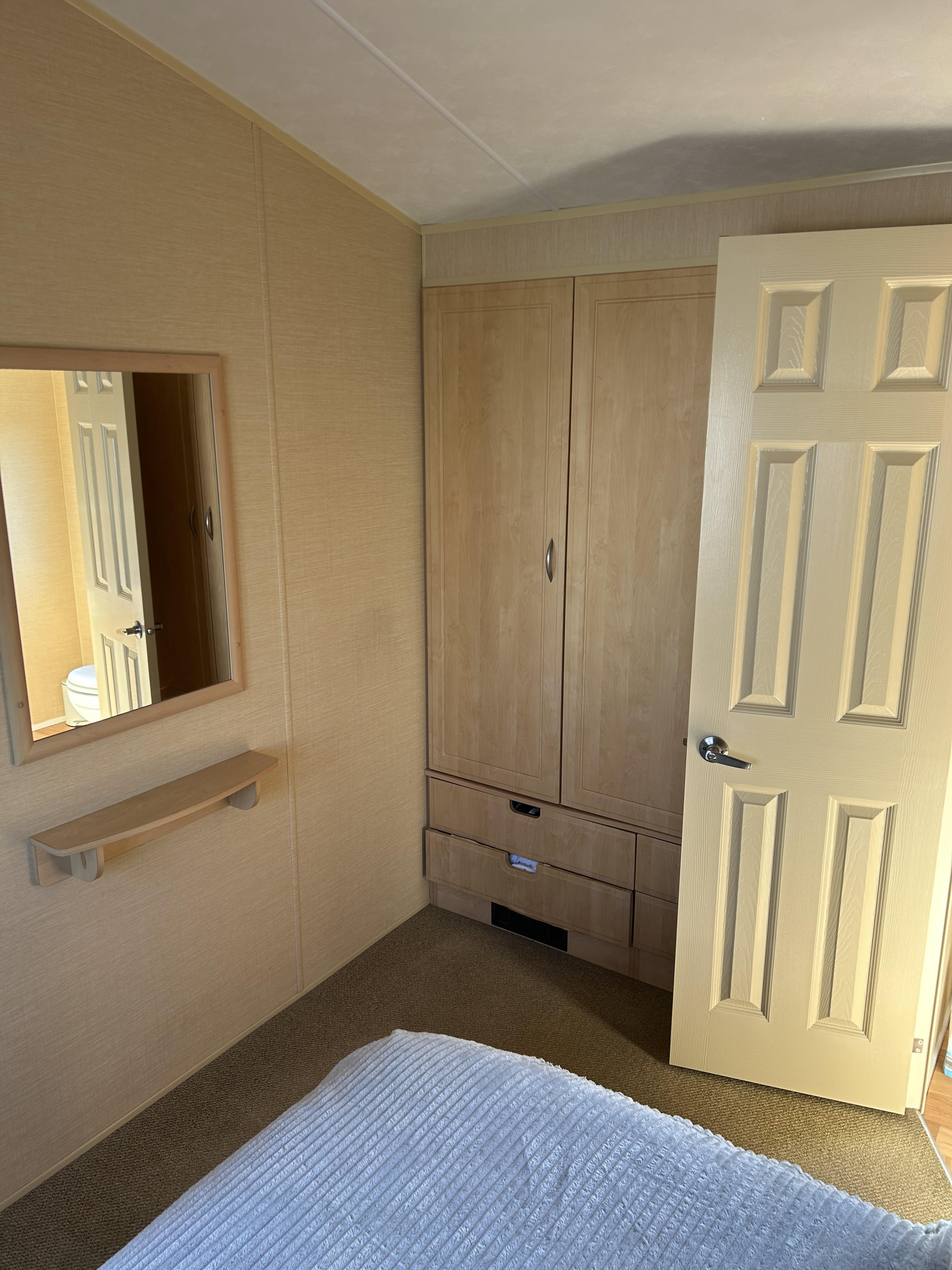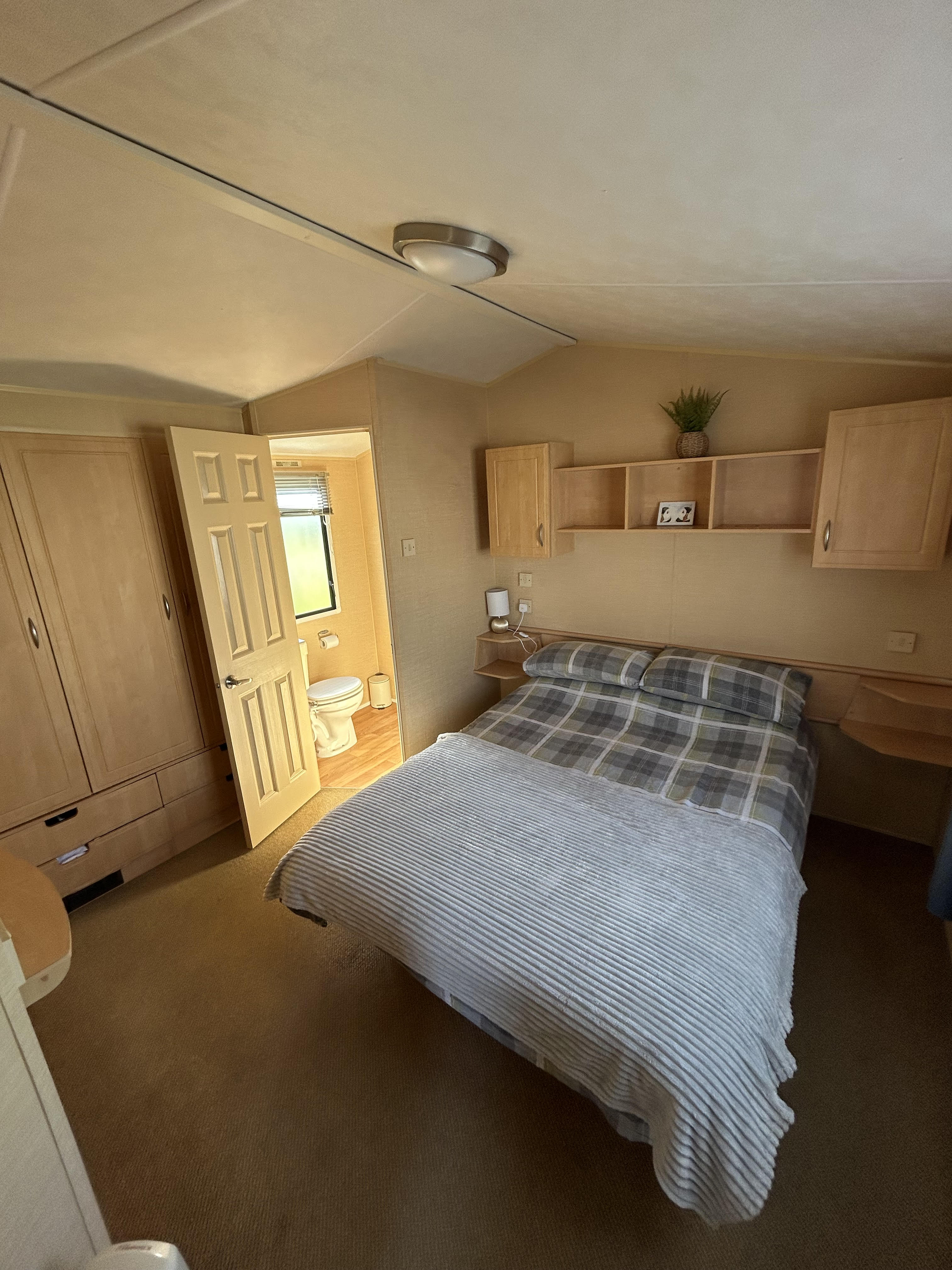 Master bedroom is spacious with a double bed, wardrobes and overhead shelving, with an en-suite wc