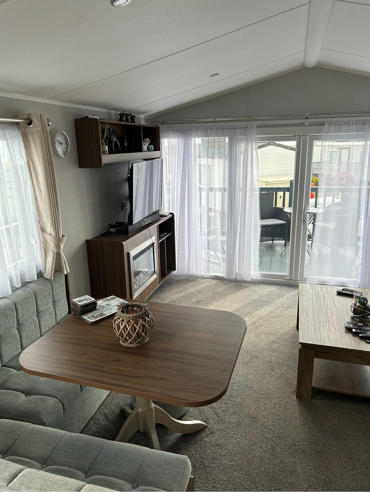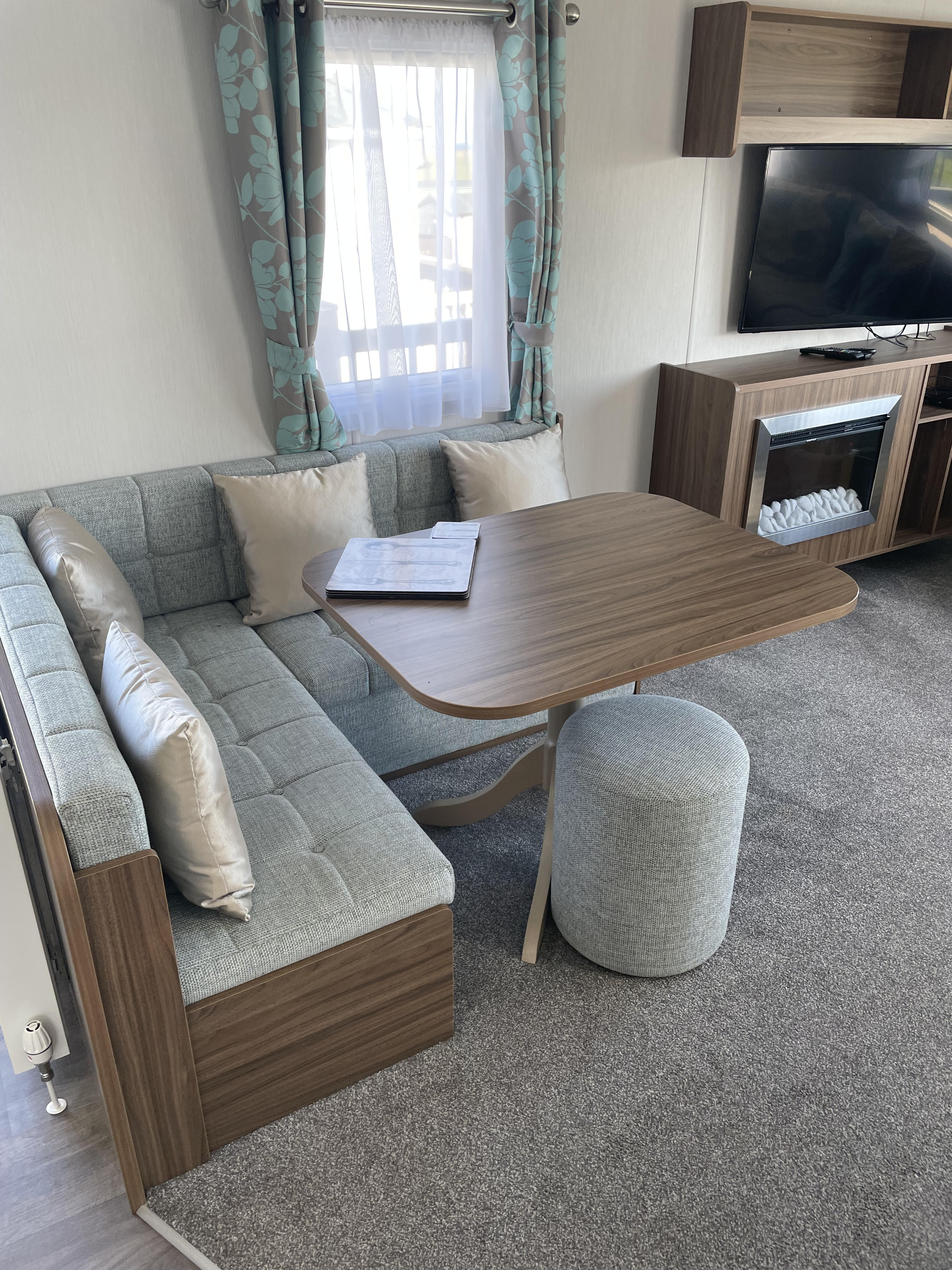 Large seating in living area with electric fire and large TV with Freesat.