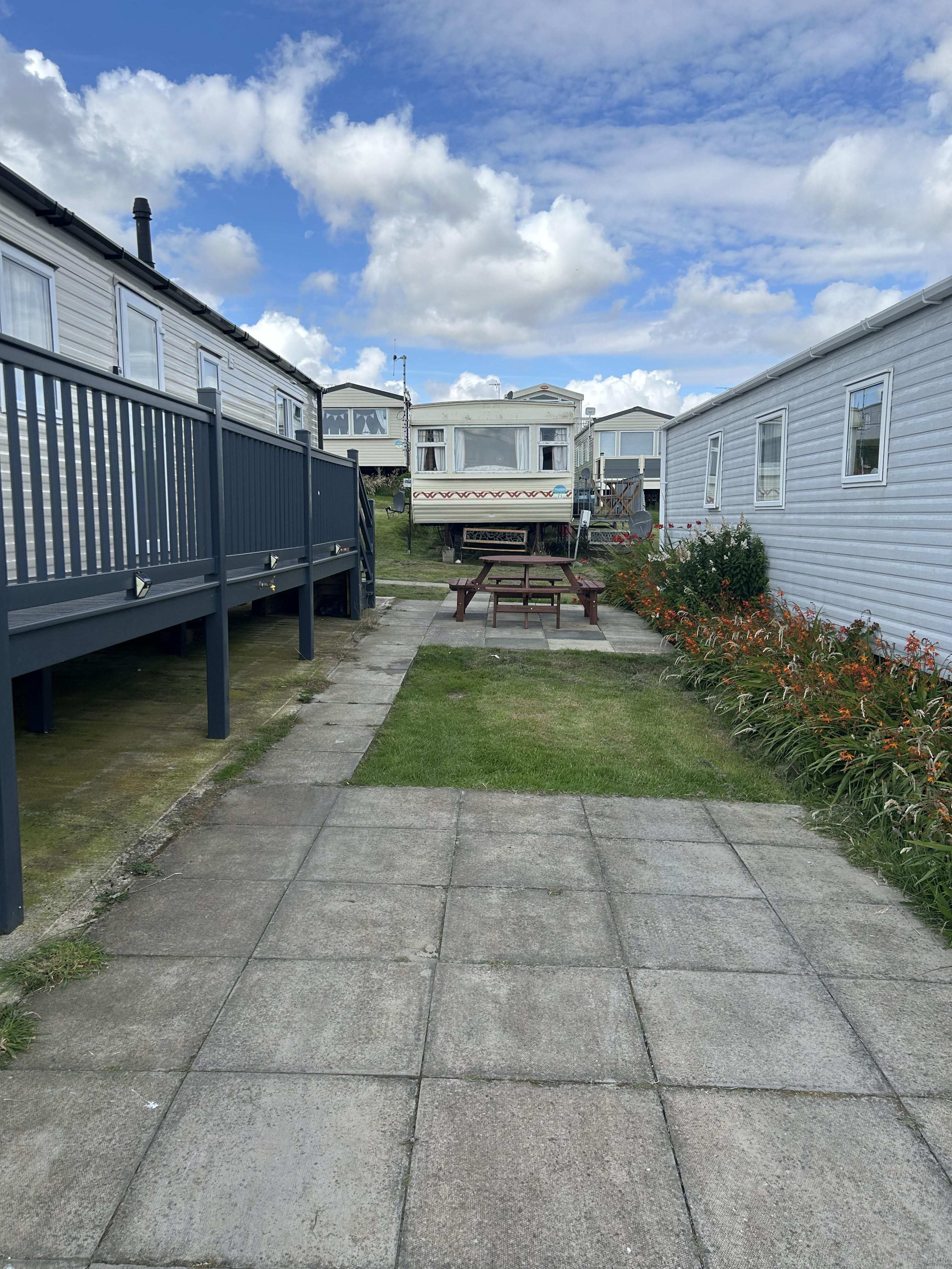 Patio area at the side of the caravan with bench furniture